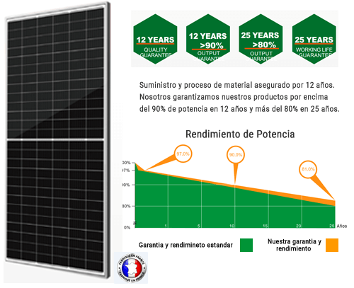 Fabricados con celdas grado “A” de alta calidad, encapsuladas en EVA transparente con vidrio templado de 4mm. Con protección en la parte posterior de TEDLAR resistente a los rayos UV y con laminados montados sobre un marco de aluminio anodizado, aseguran la máxima protección y durabilidad de los paneles, con garantías de hasta 25 años de potencial lineal.