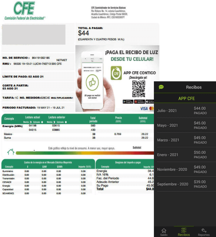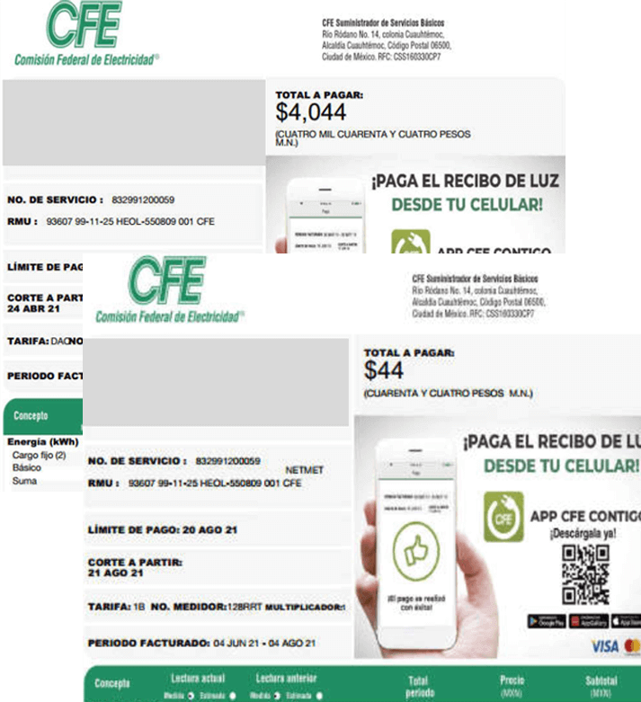 Este cliente instaló su sistema fotovoltaico antes de realizar su contrato de CFE en su casa nueva y gracias a la asesoría que le hicimos, desde el primer día paga sólo alrededor de 44.00 pesos bimestrales en su recibo de luz.